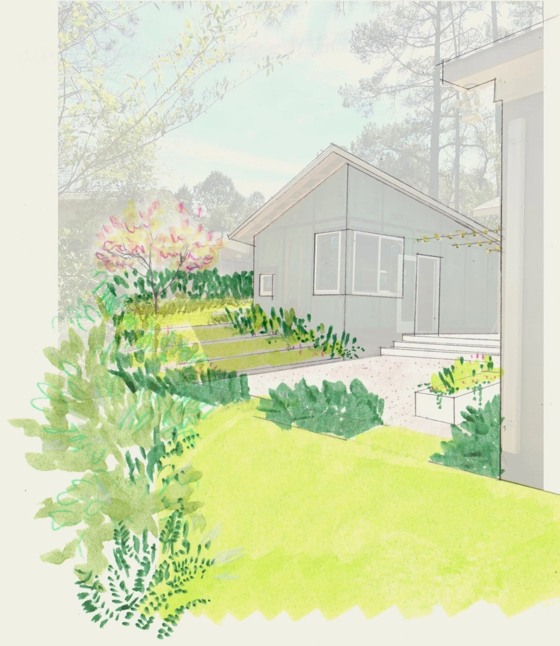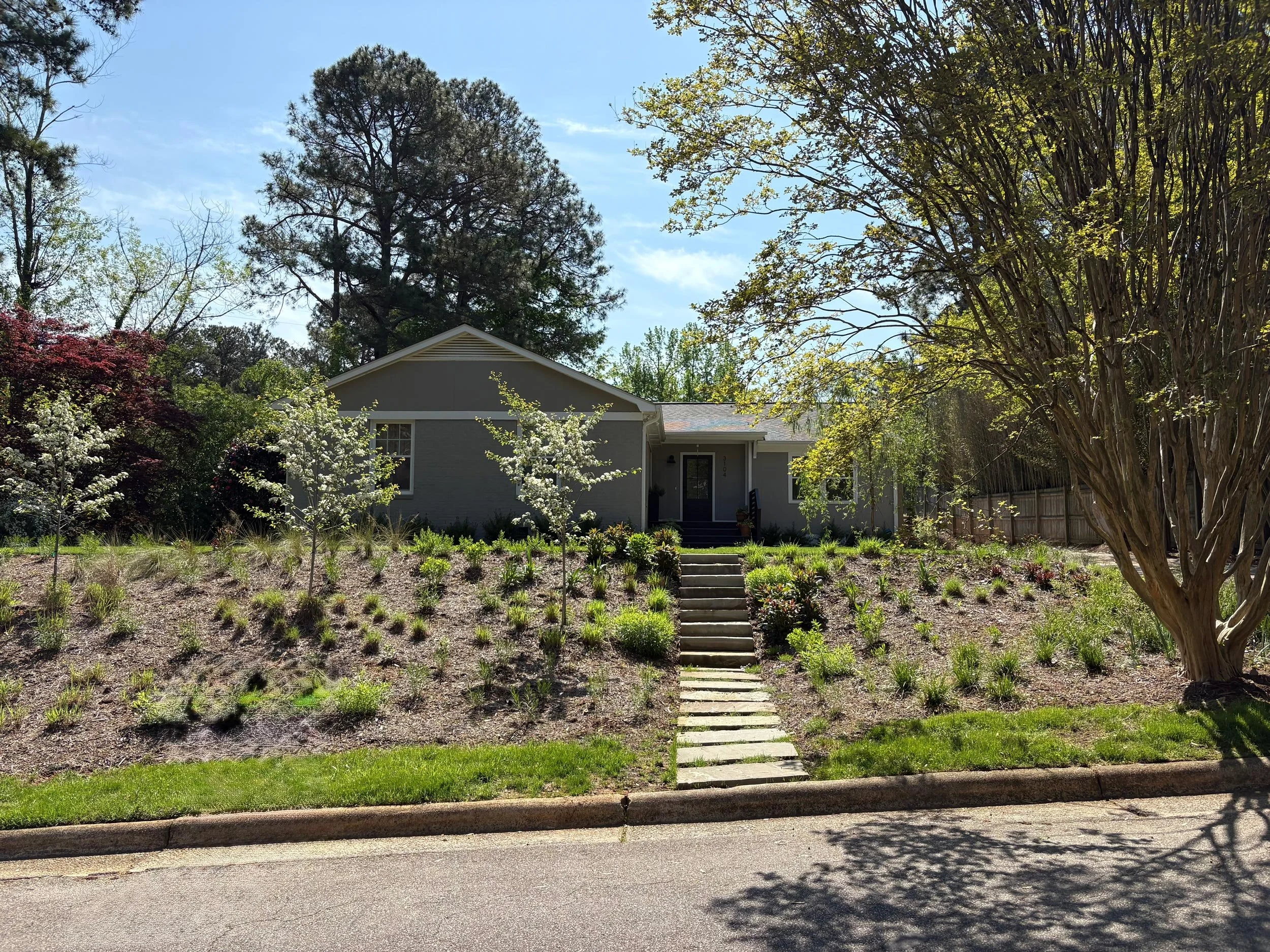 Following a house renovation and the construction of a new accessory building, excess soil was redistributed to create a flatter, more usable front yard. Concrete pavers provide an informal outdoor patio out front while doubling as a temporary parking space, and a series of bluestone steps help visitors navigate the steep hill, stabilized with sun-loving grasses. As they walk up the steps, visitors are immersed into the meadow before emerging onto a lush lawn surrounded by flowers, creating a sense of arrival into the garden.