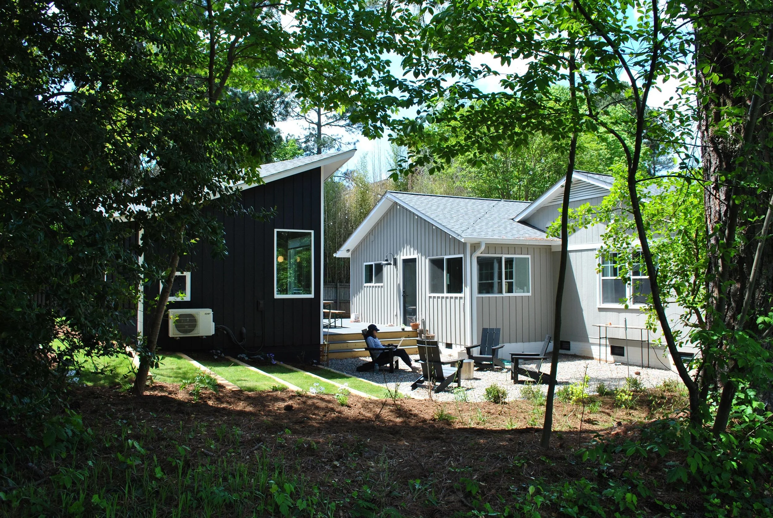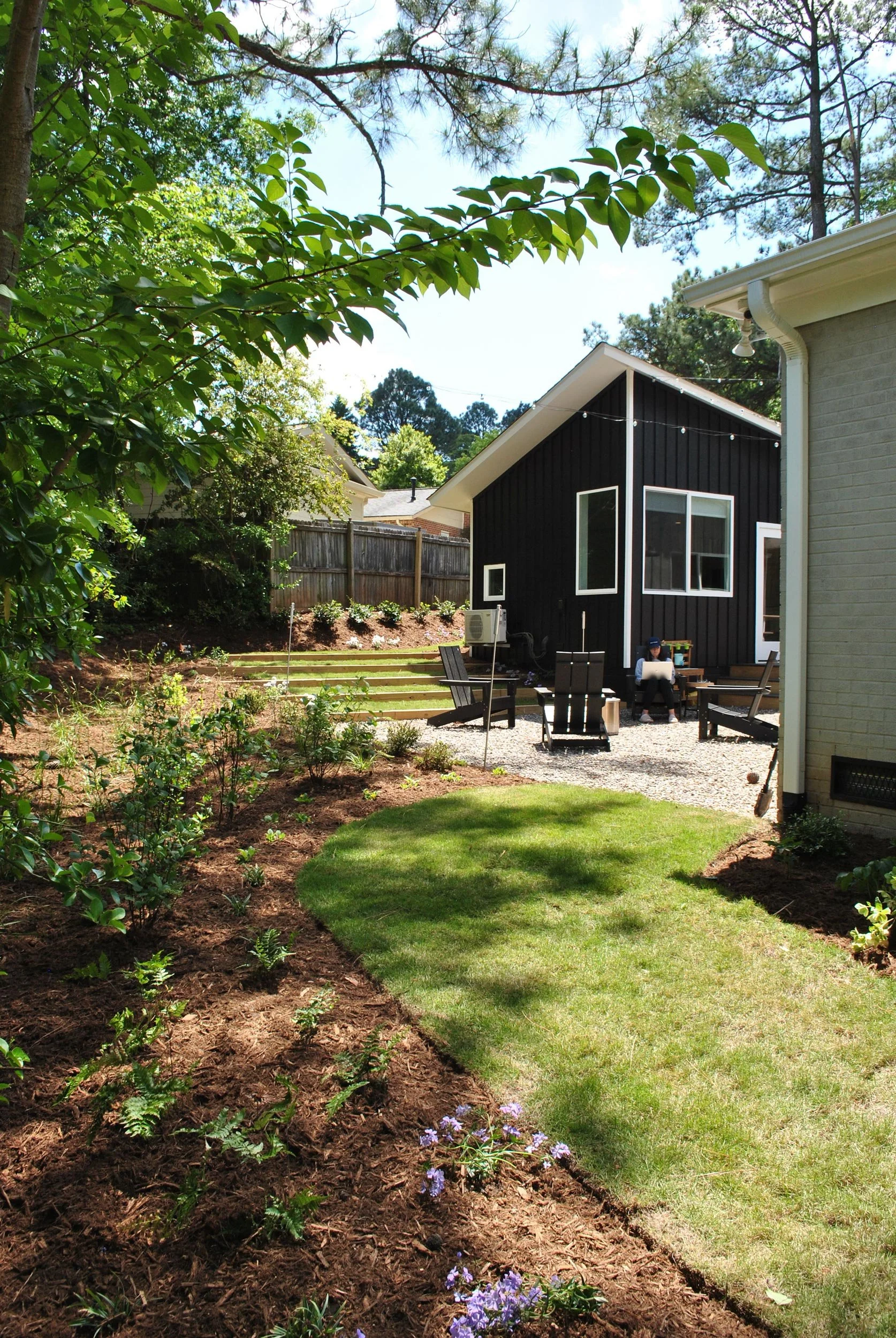 At the side of the house, the lawn narrows into a path which circles the entire property, with pockets for playing, daydreaming, or hiding. Behind the house, the deck – which connects to the new home office – steps down onto a stone patio used for smores and storytelling. Gentle landscape steps made of lawn and heavy timber provide seating for outdoor movies, while navigating the slope at the back of the property.